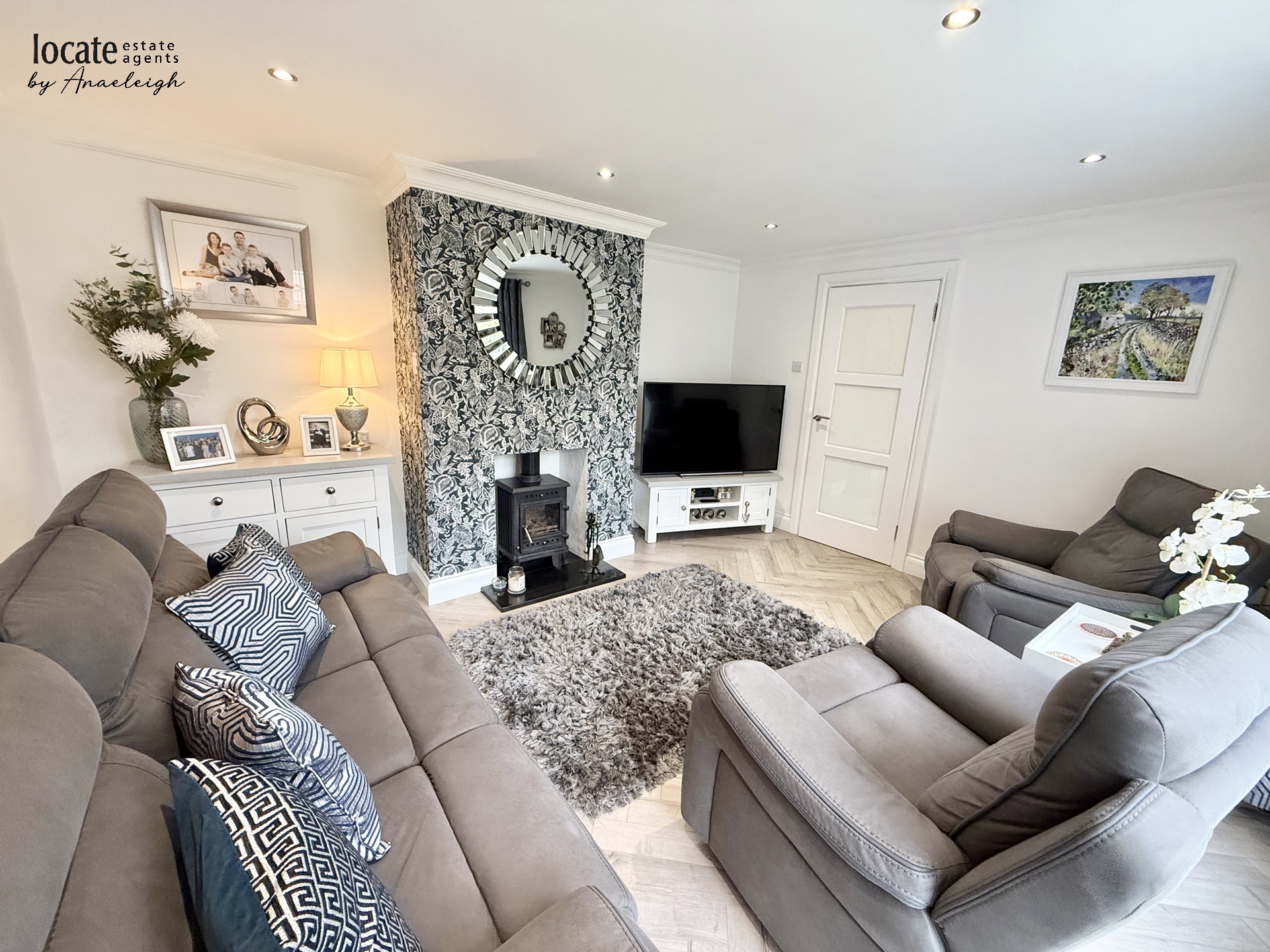 Lounge | 14'2" x 11'8" (4.32m x 3.56m) Multi-fuel stove set into fireplace, laminated Herringbone wooden floor | |||