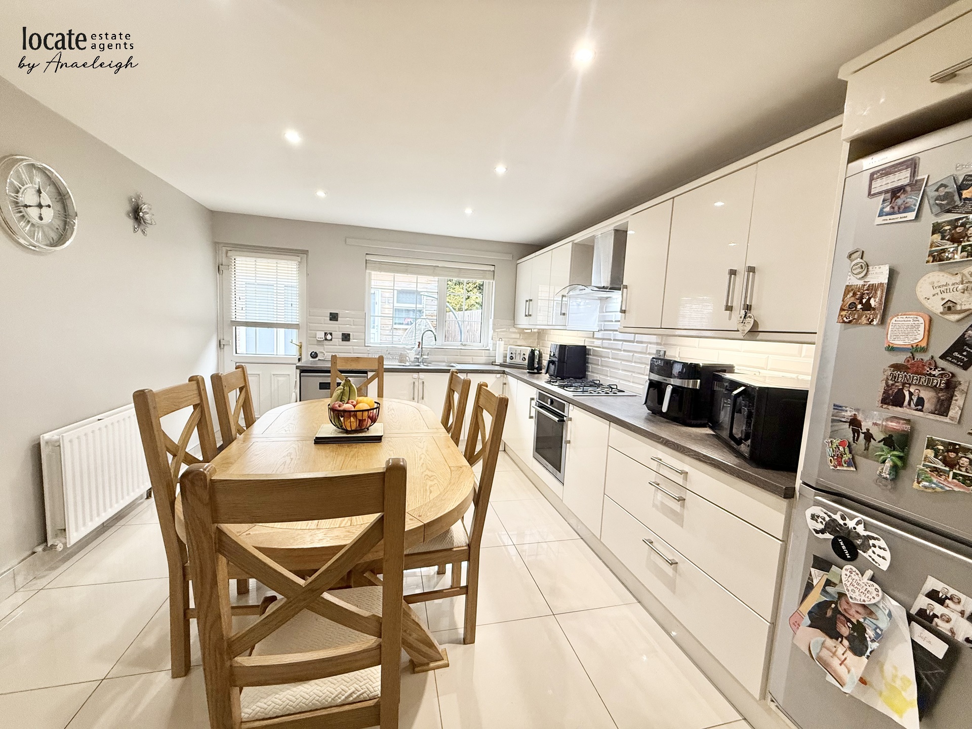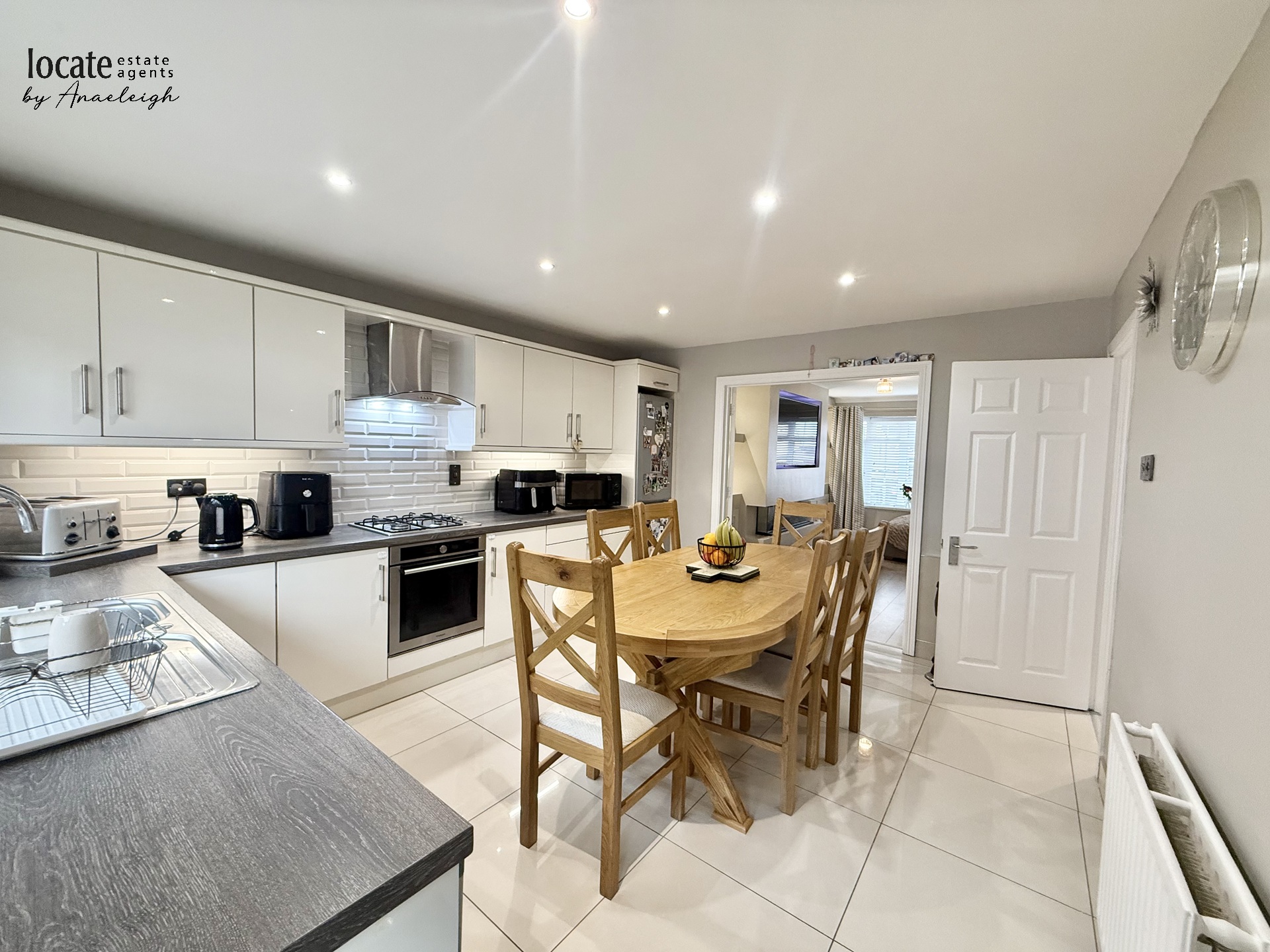 Kitchen | 13'11" x 11'6" (4.24m x 3.51m) Eye and low level units, 1 1/2 stainless steel sink uit with mixer tap, fridge/freezer, gas hob, electric oven, extrator fan, dishwasher, tiled floor, back door to rear | |||
