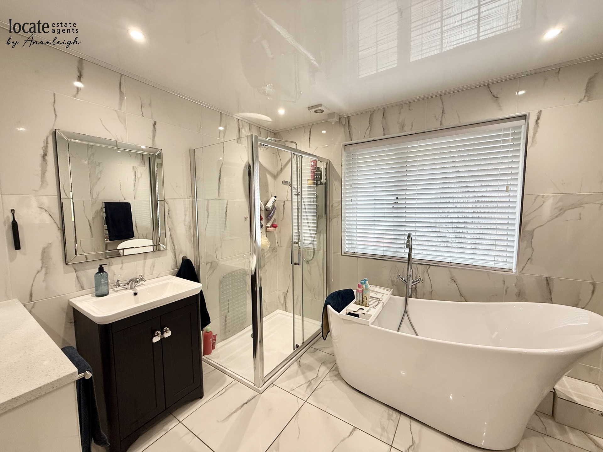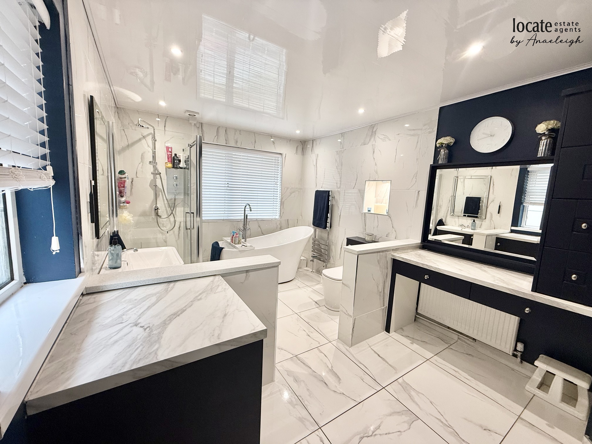 Family Bathroom | Vanity area with sliderobes, free standing bath, shower, wc, wash hand basin in vanity, tiled floor, fully tiled walls | |||
